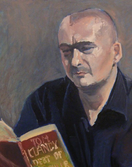 Epi-titel: In Tom Clancy's Debt of honour lezende Bart FM Droog